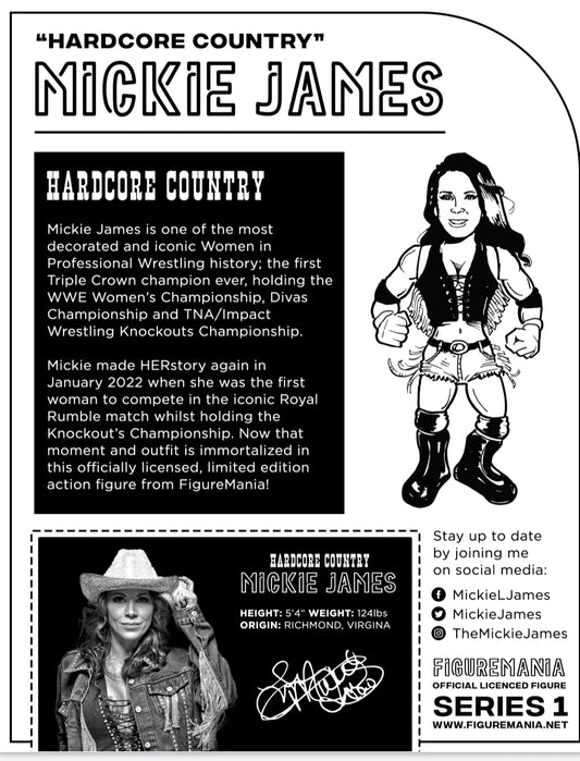 Welcome to FigureMania! Our aim is to bring you limited-edition figures and collectibles of some of your favorite stars of the squared circle and beyond, starting with the incomparable Mickie James! Join our mailing list at the bottom of the page (we promise we hate spam as much as you do) so you can be the first to know about new items, early access and special offers.